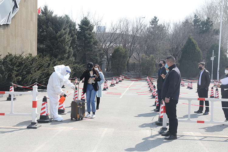 返校学生按照返校流程,从入校等待区排队,前后间隔一米,形成蛇形排列等待入校。党委学生工作部在学生返校前组织学生关注“盛事通”公众号,获取健康通行码,报到区工作人员对入校学生进行身份验证、健康码检查后,经过消毒、三次体温检测合格后学生方可入校。