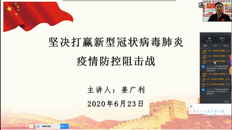 6月22日13:00时,纪委书记姜广利以《坚决打赢新型冠状病毒肺炎疫情防控阻击战》为题,利用钉钉直播,为管理与新闻传播学院2019级新闻1班、2班全体学生上了一堂生动的形势与政策课。