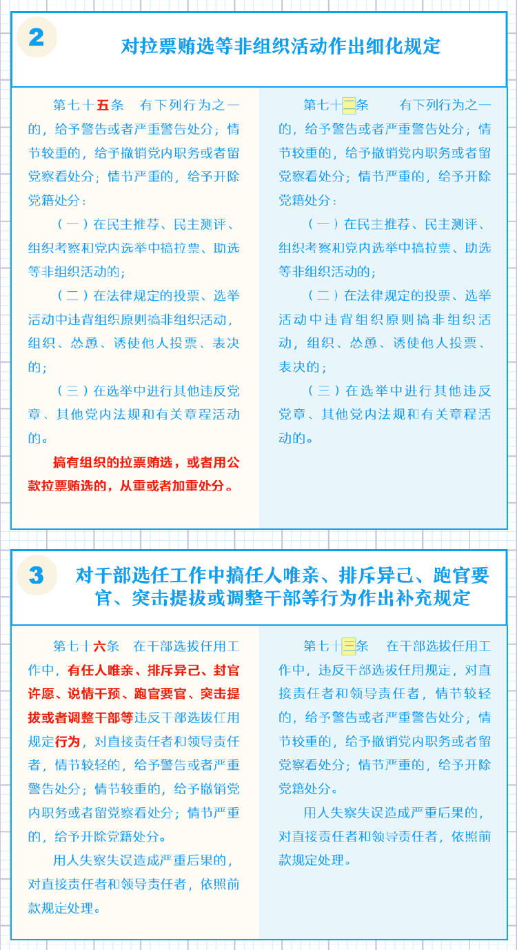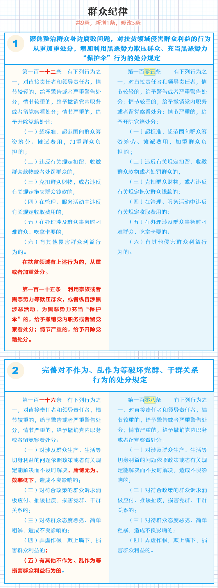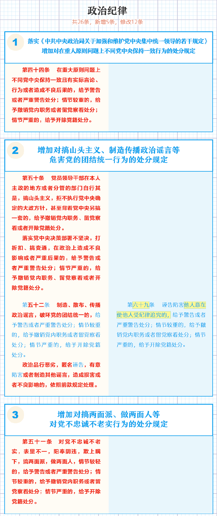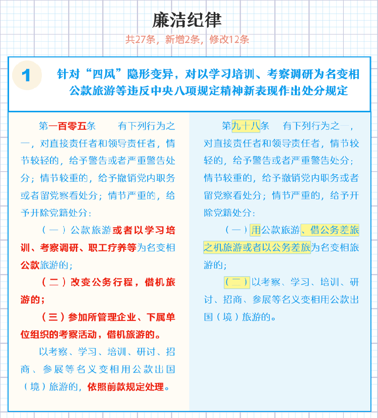 一图了解《中国共产党纪律处分条例》修订的主要内容 2018年11月21日 09:58 点击:[] 上一条:【给“两面人”画个像】之一 台上一套台下一套,当面一套背后一套 下一条:【一定之规·党纪处分条例】这些事千万不能做!生活纪律新规 【关闭】